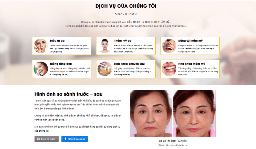 Những chuyên mục chính gồm: Giới thiệu, Điều trị da, Nha khoa, Tin tức, Khách hàng và Liên hệ. Điểm nhấn chính nằm ở những dịch vụ mà doanh nghiệp mang lại, và hiệu quả trước – sau khi điều trị ở Spa.
